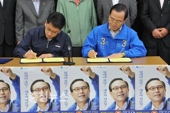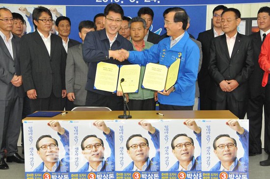 자유선진당 박상돈 충남도지사 후보는 24일 오전 천안시 쌍용동 미라빌딩 3층 후보사무소에서 한국노총 충남지역본부와 정책협약을 맺고 노총의 지지를 수용했다.