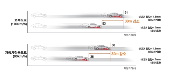 한국타이어에서 실험한 결과에 따르면, 실제로 젖은 노면에서 시속 100km 이상 달리다가 급제동 시, 홈의 깊이가 7mm인 새 타이어를 장착했을 때와 비교하면 홈의 깊이가 1.6mm로 심하게 마모된 타이어는 약 2배 가까이 제동력이 차이가 났다. 더욱이 시속 80km속도의 코너링 실험에서는 마모 정도가 거의 없는 타이어는 2~3m가량 미끄러지는 데 반해, 마모 정도가 심한 타이어는 도로 밖으로 이탈하는 등 위험성이 극명하게 드러났다.