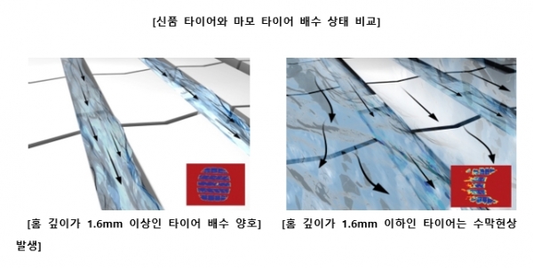 많은 운전자들이 장마철 빗길에서의 타이어 마모도에 따른 위험성을 감지하고는 있지만 실제 위험 상황에 대한 경험이 많지 않기 때문에 세심하게 살펴보지 못하는 경우가 많다. 실제로 동일한 타이어 마모 상태로 제동력 테스트를 진행하는 경우 젖은 노면에서의 미끄러지는 거리는 일반 도로보다 1.5배 이상 길어진다.