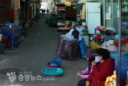 천안중앙시장도 사정은 마찬가지. 시장 내에서 가장 큰 골목인 수선정길은 동문입구부터 시작되는 폭 7m, 길이 97m의 넓은 골목에 마스크를 쓴 노부부 한 쌍이 손님의 전부였다.
