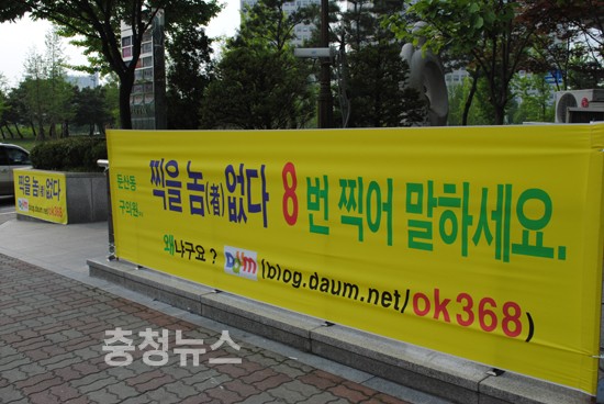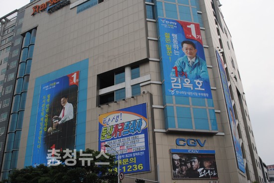김 후보는 월평동 선사시네마타운 건물옥상에 자신을 홍보하기 위한 현수막과 영화관의 건물에 자신의 얼굴을 크게 걸어놓고 관심을 끄는 데는 일단 성공했다는 평가다.