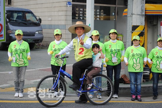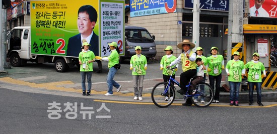 민주당 동구2선거구 송석범 후보는 노무현 전 대통령 차림으로 자전거를 타면서 유권자의 표심을 자극하고 있다.