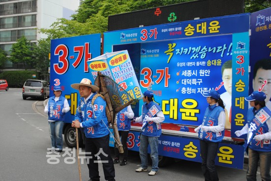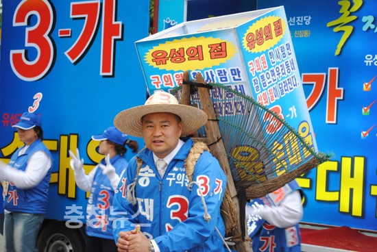 자유선진당 유성 가선거구(온천,진잠동) 3-가에 출마한 송대윤 후보는 ‘시골에서 농사꾼들이 사용하던 지게를 지고 유권자에게 한표를 호소하고 있다.