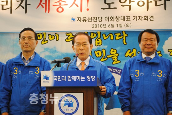▲ 이회창 대표가 6월1일 대전 오페라홀에서 선진당 후보에 대한 지지를 당부하는 기자회견을 하고 있다.