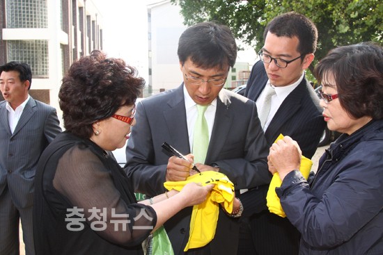 ▲투표 후 밖에 있던 시민들이 내민 티셔츠에 싸인해주고 있는 안희정 당선자
