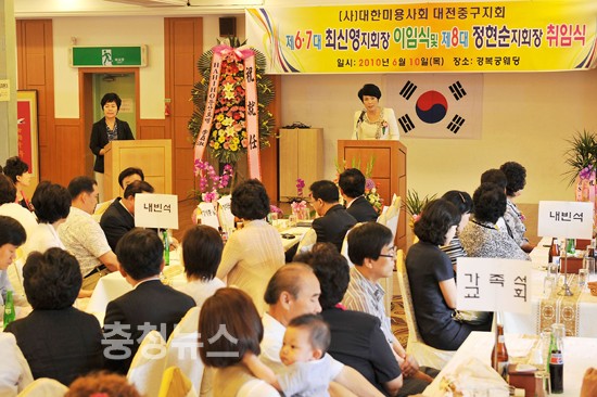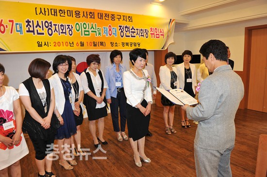 대한미용사회 대전시 중구지회는 10일 오류동 경복궁웨딩홀에서 6여 년 동안 미용사회를 이끌던 최신영(남,56) 지회장이 이임하고 제8대 신임회장으로 정현순(여,46)씨가 선정되어 이․취임식을 가졌다고 한다.