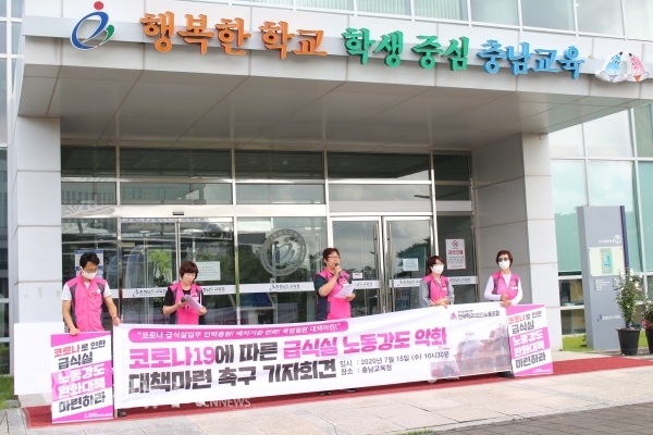 전국학교비정규직노동조합 충남지부는 15일 충남도교육청 앞에서 기자회견을 열고 "교육청은 노동 강도를 완화할 수 있도록 대책을 마련하라"고 촉구했다.