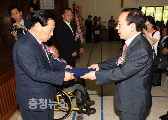 ▲ 박양화 원장(충남장애인생산품판매시설)에게이인화도지사권한대행이 도지사표창을전달하고있다