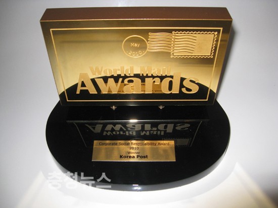 충청체신청(청장 이상진)은 우정사업본부가 17일(한국시간) 덴마크 코펜하겐에서 열린 세계우편상 시상식에서 사회취약계층에 대한 지원을 강화하고 직원들이 적극적으로 현장 중심의 사회공헌활동을 펼쳐 ‘기업의 사회적 책무 부문’을 수상했다고 밝혔다.