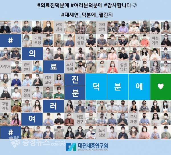 이에 대전세종연구원은 ‘#덕분에 챌린지’ 캠페인 동참을 통해 팬데믹의 최전선에 있는 의료진, 방역당국, 대전 시민들에게 덕분에 이 상황을 잘 극복하고 있음에 감사를 표하였으며, 코로나19의 완전한 통제가 가능한 그 날까지 안전을 위한 사회적 거리두기 및 생활방역 지침을 지속하여 준수할 것을 한 번 더 다짐하였다.
