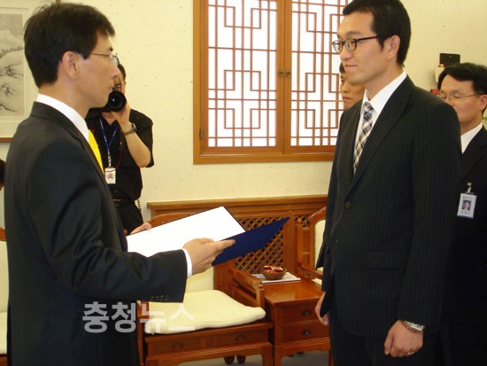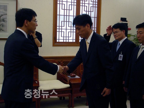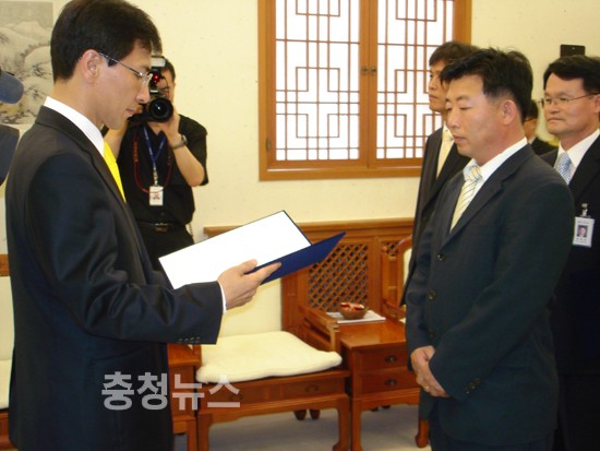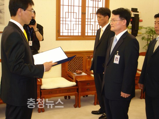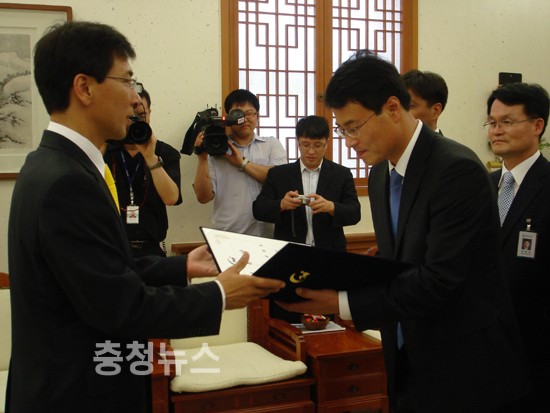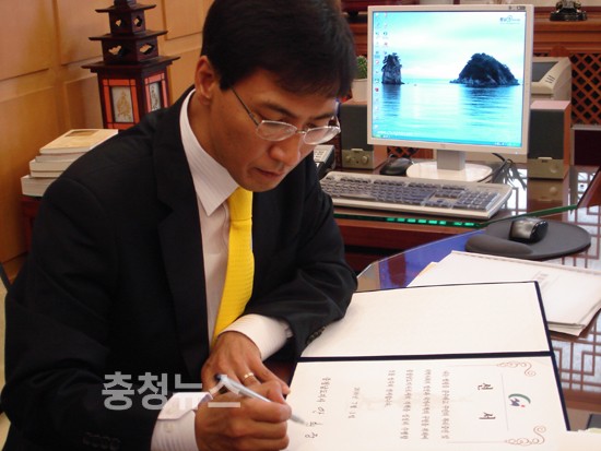 안희정 도지사는 1일 오후 직무실에서 업무인수에 서명을 한후 공식적인 도지사로서의 권한을 행사했다.