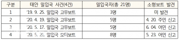 태안해양경찰서에 따르면, 지난 5월 23일 태안 해변에서 발견된 밀입국 의심 보트 주민 신고에 따라 수사대책팀을 꾸려 수사에 착수했다. 4월 19일에 5명, 5월 17일에 5명, 5월 21일에 8명이 각각 밀입국한 것으로 확인했다.