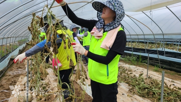 충남농협(본부장 길정섭)은 논산시 부적면 왕덕리 시설하우스 침수피해 농가를 찾아 농협논산시지부, 노성농협 직원 등 농촌봉사단 40여명은 멜론하우스 8동에서 고사한 멜론 넝쿨제거 및 비닐걷이와 파손된 농자재 철거, 배수로 토사제거 등 피해복구에 총력을 기울이며 시름에 찬 농가와 어려움을 함께했다.