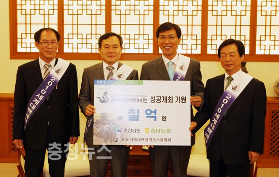 충남도와 2010세계대백제전 조직위원회(이하 조직위. 위원장 최석원)는 농협중앙회 충남지역본부(본부장 신충식)가 이날 오전 10시 충남도 안희정 지사를 예방, 대백제전의 성공개최를 위해 후원금 7억원을 기탁 후 백제전 성공개최를 위한 다양한 의견을 교환했다고 밝혔다.