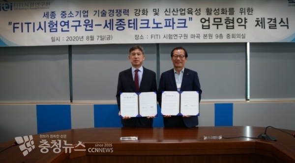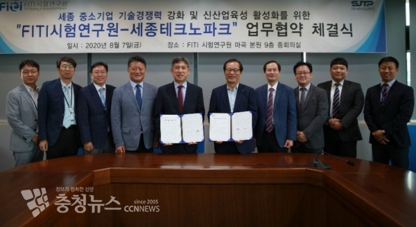 세종시의 지역산업거점기관인 세종테크노파크(원장 김현태)는 7일 글로벌 종합 시험인증기관인 (재)FITI시험연구원(원장 전제구)과“세종 중소기업 기술경쟁력 강화 및 신산업 육성 활성화”를 위한 업무협력협약(MOU)을 체결했다.