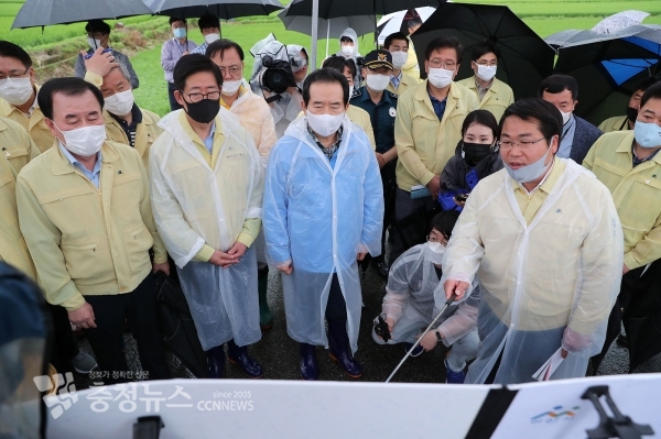 이날 현장을 동행한 양 지사는 정 총리에게 도내 수해 및 응급 복구 추진 현황 보고를 통해 지난 7일 천안·아산 지역을 특별재난지역으로 신속하게 선포해 준 점에 대해 감사의 뜻을 전했다.