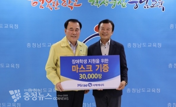 장애학생 지원 마스크 기증식충남교육청(교육감 김지철)은 10일 ㈜미래엔서해에너지(대표이사 박영수)로부터 ‘장애학생에게 써달라’며 마스크 3만장을 기증받았다고 밝혔다.