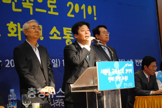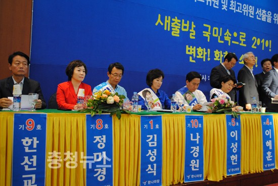 친박계 후보들은 하나같이 '세종시 논란'의 중심에 있었던 충청민심을 의식한 발언이 쏟아져 나왔다 이들후보는 "세종시 수정안을 찬성한 후보들은 당 지도부에 들어갈 자격이 없다"며 친이계에게 직격탄을 날렸다.