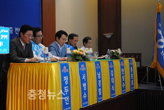 대전둔산동 오페라 컨벤션에서 열린 대전·충남·충북 정책비전발표회에서 안상수,홍준표후보로 양강구도를 형성하면서 후보들은'세대교체 쇄신' '친박친이간 화합'의 적임자임을 강조하며 표심잡기에 나섰다.