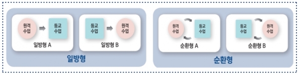 일방형은 전체 수업을 크게 ‘원격수업+등교수업’ 혹은 ‘등교수업+원격수업’으로 나누어 수업 환경이 한 번만 바뀌어 운영되는 형태이고, 순환형은 전체 수업 ‘원격수업+등교수업+원격수업+…’ 혹은 ‘등교수업+원격수업+등교수업+…’으로 수업 환경이 여러 번 바뀌어 운영되는 형태이다.