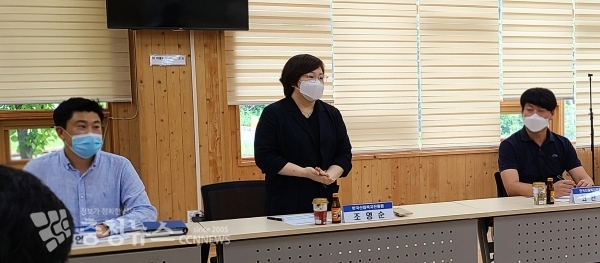 조영순(가운데) 한국산림복지진흥원 경영기획본부장이 21일 경북 영주시 국립산림치유원 소회의실에서 열린 ‘모·자회사 노사공동협의회’에서 인사말을 하고 있다. 이번 협의회는 근로자의 노동조건과 작업환경, 복지 등 공동이익 증진과 소통 강화를 위해 마련됐다.