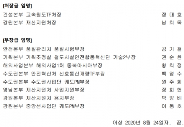 한국철도시설공단은 8월 인사발령사항(처/부장 신규 보직발령)을 다음과 같이 실시했다.