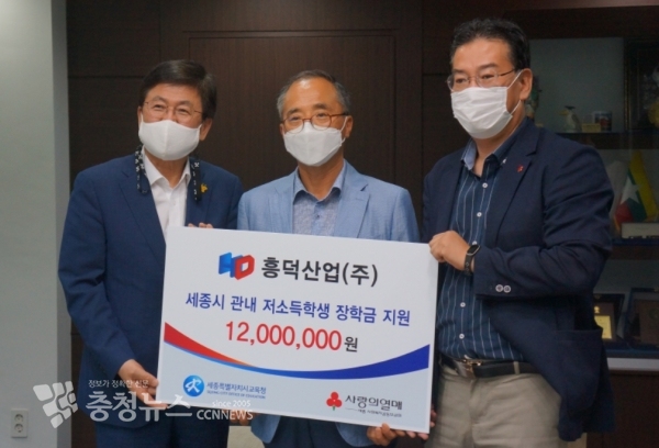 세종사회복지공동모금회(회장 홍영섭, 이하 세종모금회)는 27일 세종특별자치시 교육청(교육감 최교진)에서, 흥덕산업㈜ (대표 황종분․김윤회)이 세종지역 저소득가정 학생을 위해 장학금 1,200만원을 기탁했다.