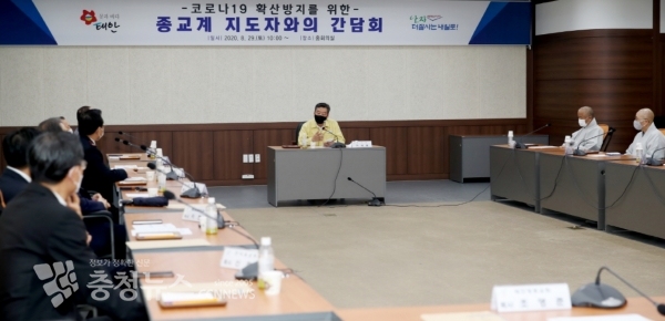 가세로 태안군수가 29일 중회의실에서 코로나19의 지역 확산 방지를 위해 관내 종교계 지도자들과 긴급 간담회를 가졌다.