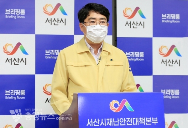 비대면 긴급 언론 브리핑 하는 맹정호 서산시장