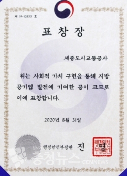 세종도시교통공사(사장 배준석)는 “8월 31일 사회적 가치 구현을 통해 지방공기업 발전에 기여한 공으로 행정안정부장관 기관표창을 수상했다”고 2일 밝혔다.