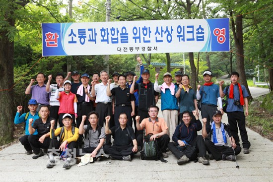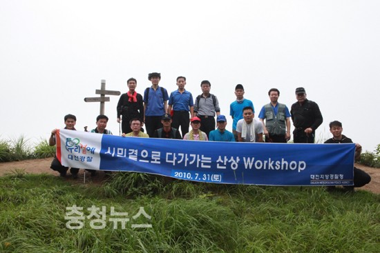 대전지방경찰청장(청장 강찬조)은 7. 31(토) ~ 8. 01(일) 이틀간 식장산에서 각 과 · 계장 등 46명과 함께 활기찬 직장문화 조성과 상하 · 동료 간 의사소통 활성화를 도모하고 정성을 다하는 국민의 경찰상을 구현하기 위해 식장산을 등반하는 「산상 워크숍」을 주재했다.