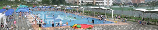 신탄진의 로하스 야외수영장이 무더운 올여름 사람들의 입소문을 타 벌써 지역명소로 자리잡고 있다.