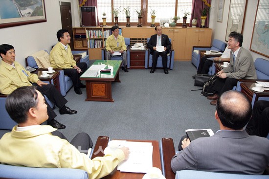 정용기 대전 대덕구청장은 18일 구청 구민의 사랑방에서 우리구 주민참여예산제와 배달강좌제 등 우수 지방자치 사례를 연구하기 위해 방한한 우치다 가즈히로 일본 훗카이학원 대학교수 일행을 접견했다.