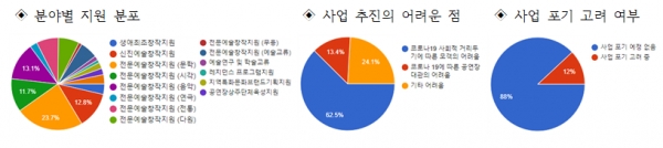 지난 8월 14일부터 28일까지 진행한 2020년 문화예술지원사업 참여 예술인 및 예술단체 대상 사업추진 현황에 관한 설문조사 결과에 따르면 예술인들은 코로나19 확산이 순수 창작 활동의 제한뿐만 아니라 모객과 대관 취소 등 도민 향유에 수반되는 한계 상황에 대한 어려움을 토로했으며 일부 예술인은 사업 포기까지 고려하고 있다.