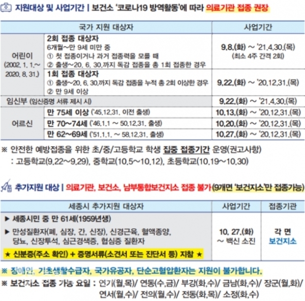 세종시보건소는 코로나19 선별검사 때문에 독감백신 접종이 불가한 상황으로, 보건소와 시청 홈페이지, 예방접종도우미사이트를 통해 접종이 가능한 의료기관을 찾으면 된다.