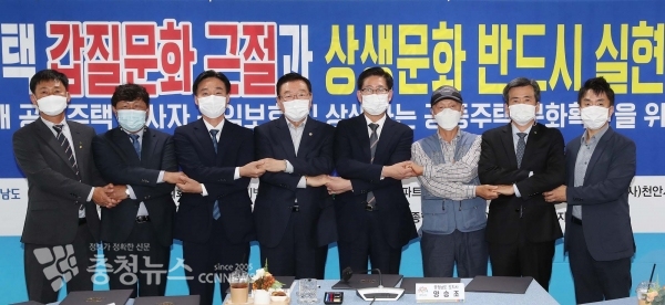 양승조 충남지사는 25일 도청에서 김석환 충남시장·군수협의회부회장, 김규석 대전지방고용노동청장, 이원식 전국아파트대표회의연합회 충남지부장, 김미수 천안시아파트입주자대표회의연합회장, 김흥수 대한주택관리사협회 충남도회장, 장동욱 충원종합관리 대표이사, 정의헌 전국아파트경비노동자공동사업단 대표 등이 참석한 가운데, ‘도내 공동주택 종사자 권익보호 및 상생하는 공동주택 문화 확산을 위한 상생협약’을 체결했다.