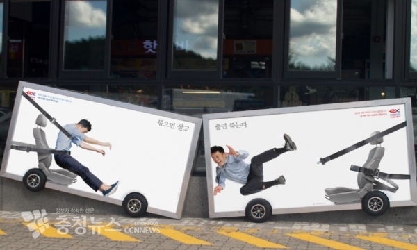 한국도로공사 대전충남본부는 세계적인 광고 전문가 이제석씨(이제석 광고연구소 대표)와 협업하여 지난 25일 경부선 옥산(부산방향) 휴게소 및 신탄진(서울방향) 휴게소에 새로운 개념의 교통안전 홍보물인 ‘보이는 안전띠 캠페인’을 최초로 선보였다.