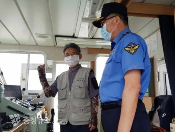 추석연휴 안전관리 강화와 함께 치안현장을 찾은 윤태연 서장이 여객선 팔봉산호 박재순 선장(64세)의 현장의견을 청취하고 있다. (출처=태안해양경찰서)