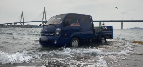 해양경찰이 연락을 20여 차례 시도했으나 통화가 안 돼 애태우던 차에 2시 50분쯤 인근 해상 유어장에서 가족과 함께 낚시하던 차주 김모씨(53세)의 아내가 대공 안내방송을 듣고 전화통화가 이뤄져 가까스로 차량 침수피해를 막았다.