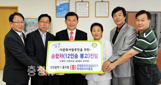 국제로타리 3680지구 백제로타리클럽(회장 윤근섭)은 7일 다문화가정과 어려운 이웃을 위해 활동하고 있는 중구 소재 다문화가정 지원단체인 (사)아름다운 숲(대표 송미림)에 승합차량을 기증했다.