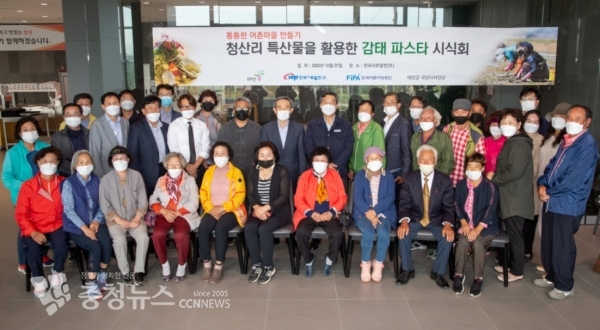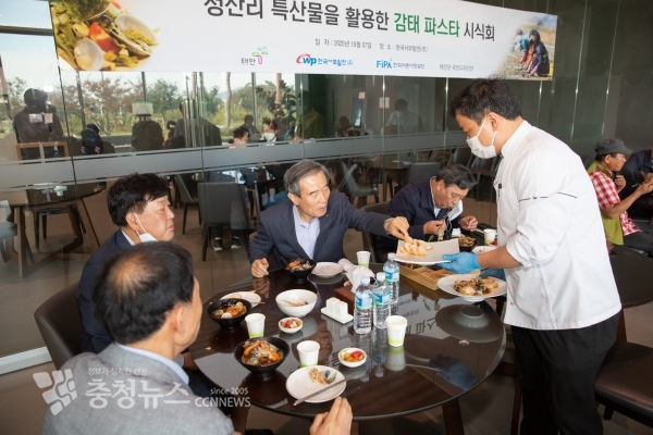 ‘청산리 특산물을 활용한 감태 파스타 시식회’에 참석한 김병숙 서부발전 사장(가운데)
