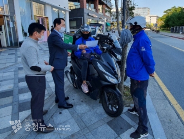 여상수 동장과 공무원들은 배달대행업체 및 배달전문음식점을 대상으로 이륜차 사고 예방을 위한 홍보물을 배포하며 배달종사자와 시민의 안전을 위해 교통법규를 철저히 준수해 줄 것을 요청했다.