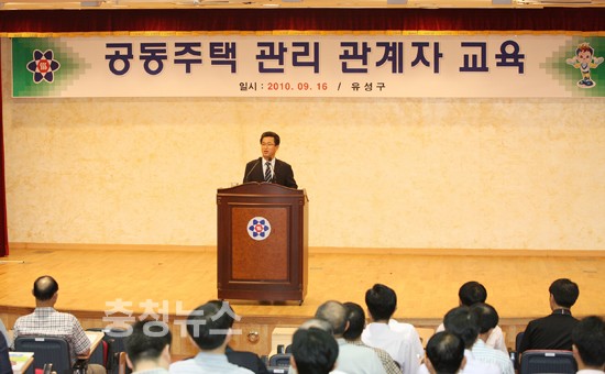 대전 유성구(구청장 허태정)는 공동주택의 효율적 관리를 위해 16일 오후 2시 구청 대강당에서 소방안전 및 방범교육을 실시했다.