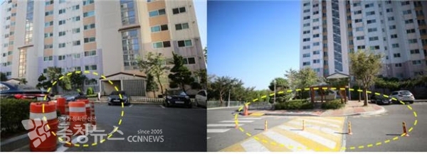 소방차량 출동로 장애구간 해소를 위해 규제봉이 설치된 아파트 모습 (좌 산호옥마을아파트/우 청구제네스)