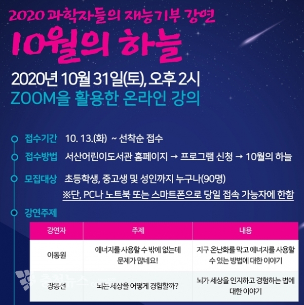 서산문화복지센터 어린이도서관(센터장 김금배)은 2020 과학자들의 재능기부 도서관 과학 강연 ‘10월의 하늘’ 을 오는 31일 오후 2시 온라인으로 진행한다.