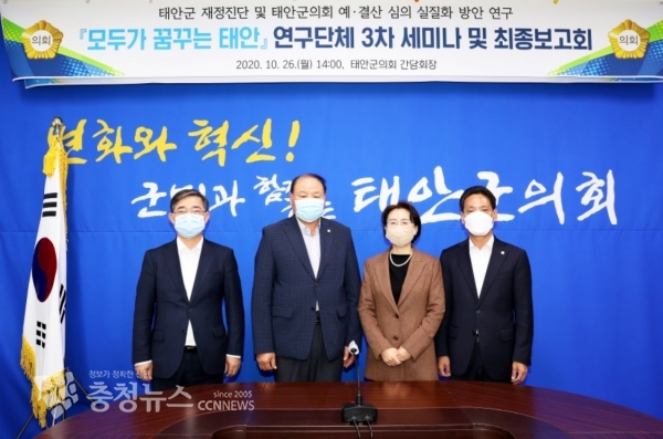 태안군의회 의원연구단체 '모두가 꿈꾸는 태안'(대표 김종욱 의원)이 26일 태안군의회 예결산 심의 실질화 방안 마련을 주제로 한 연구용역 최종보고회를 개최해 관심을 끌었다.