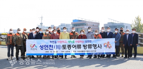 서산시 성연면(면장 김종길)이 30일 성연천에서 맹정호 서산시장 및 시 의장 및 의원, 지역 기관 ‧ 단체장 등 50여 명이 참여한 가운데 토종어류 방류행사를 개최했다.