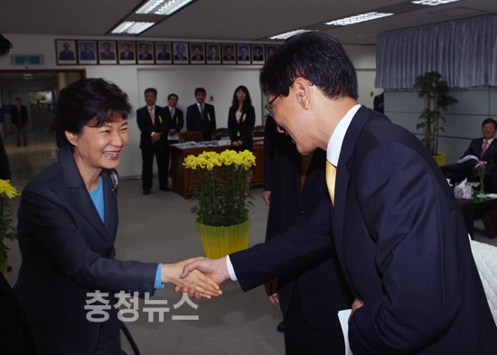 ▲ 박근혜 전 대표와 반갑게 인사하는 안희정 지사