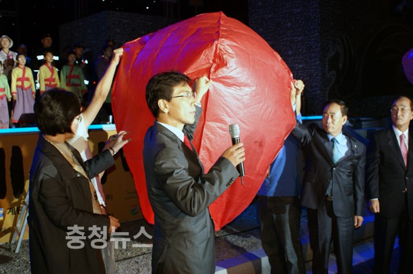 ▲ 2010 세계대백제전, 공주 고마나루 예술마당 폐막식 안희정 지사와 유병기 의장이 등을 올리고 있다