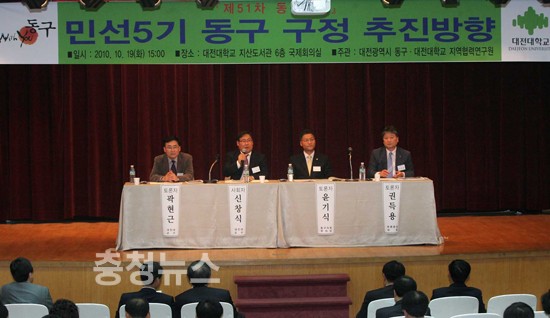 대전 동구(구청장 한현택)와 동구포럼은 민선 5기 출범 100일에 즈음해 주요 구정 및 현안사업 추진방향 모색을 위한 제51차 동구포럼을 19일 대전대학교 지산도서관 국제회의실에서 개최했다.